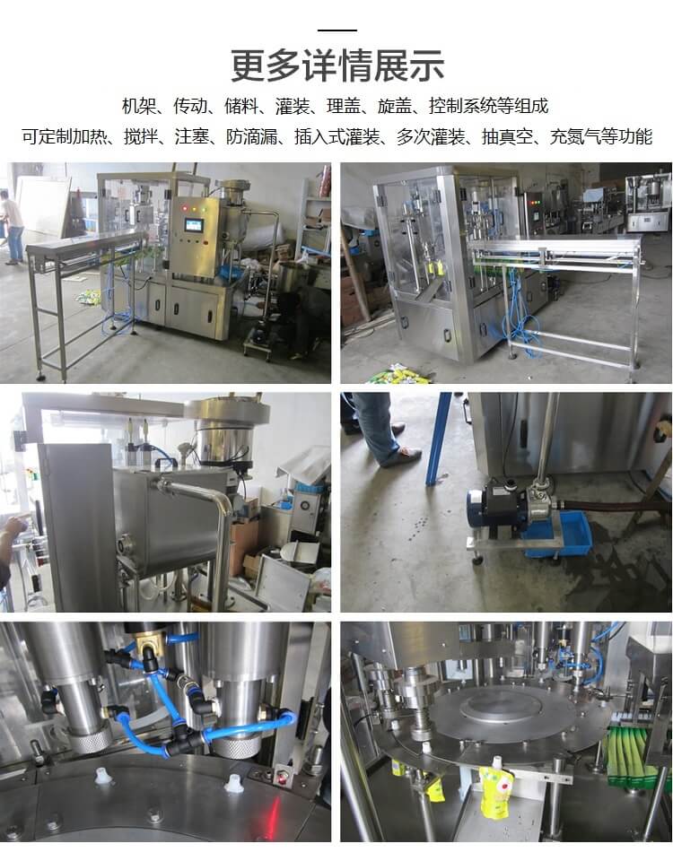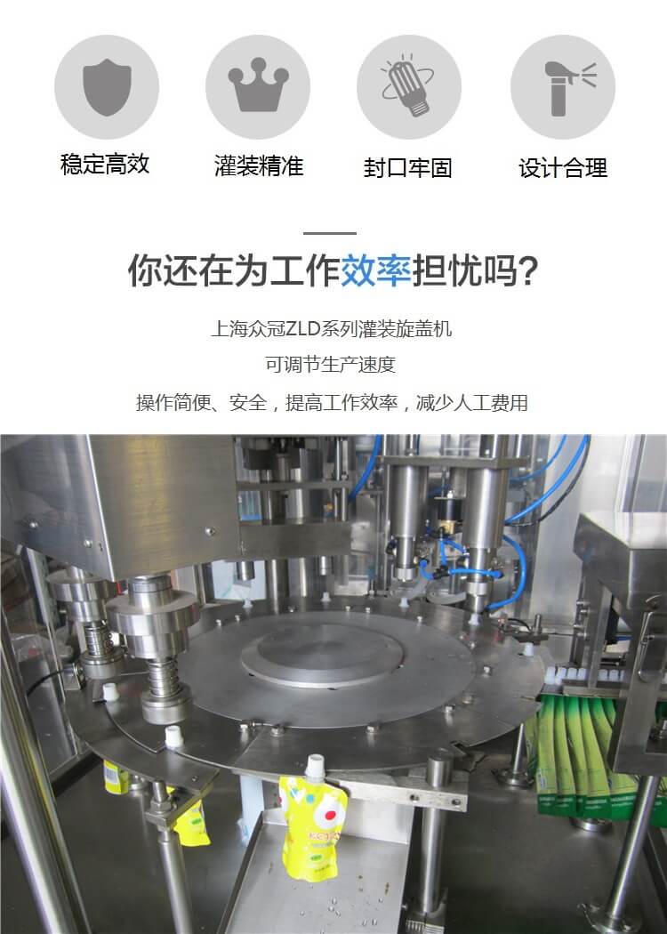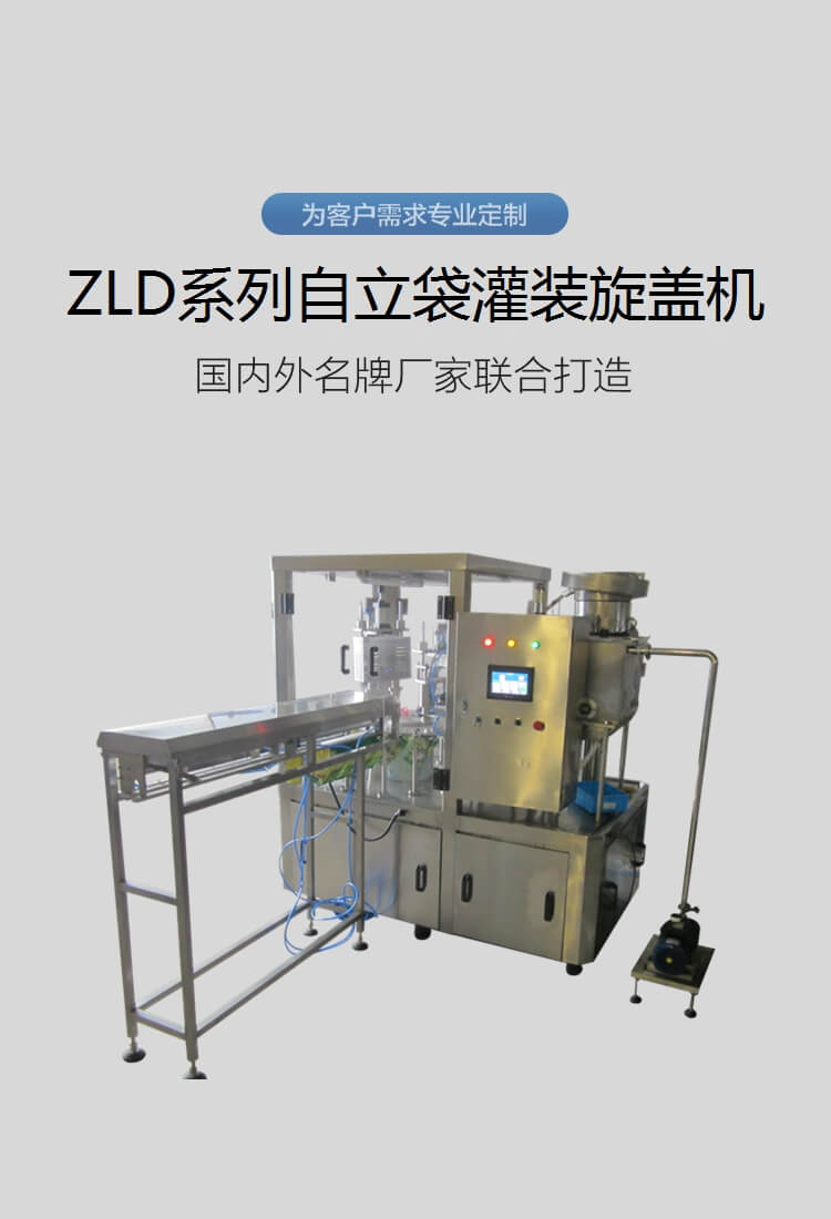ZLD-2A 全自動(dòng)自立袋/吸嘴袋灌裝旋蓋機(jī),帶充氣功能,無袋不灌裝,無蓋報(bào)警,2000袋/小時(shí)。