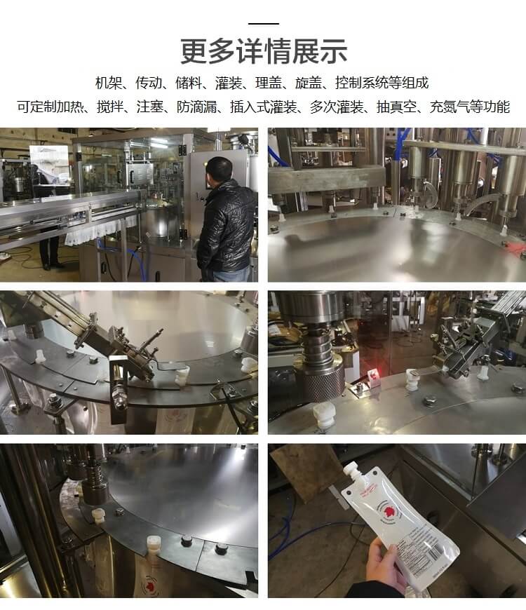 ZLD-3A 全自動(dòng)自立袋/吸嘴袋灌裝旋蓋機(jī),自動(dòng)上袋-自動(dòng)灌裝-清洗袋嘴-自動(dòng)理蓋落蓋-自動(dòng)旋蓋-自動(dòng)出成品,無(wú)袋不灌裝,無(wú)蓋報(bào)警,3000袋/小時(shí)。