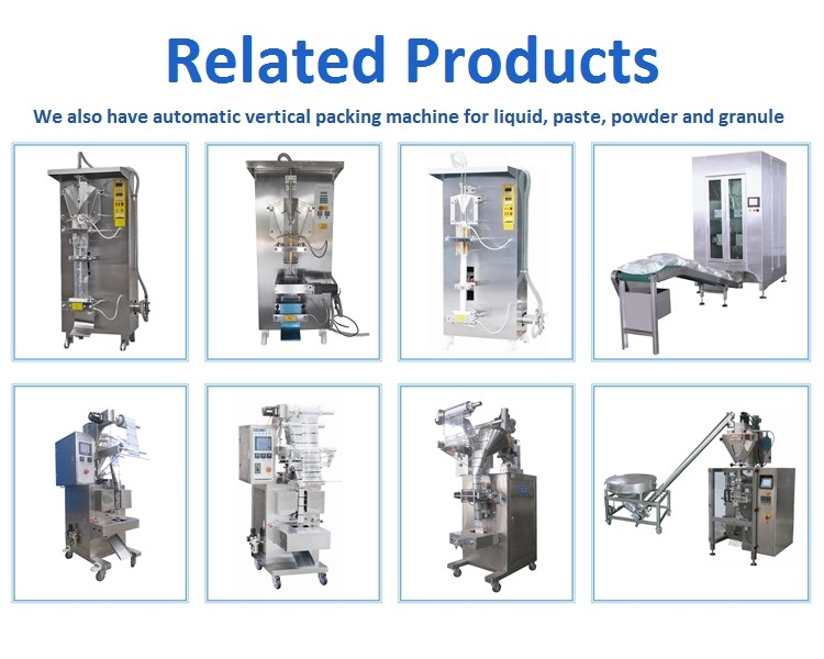 The machine is suitable for the triangle bag solid packing of grain, powder, liquid, short strip, and slices, such as slices puffed food, shrimp strip, peanut, popcorn, oatmeal, melon seeds, flavoring and so on.